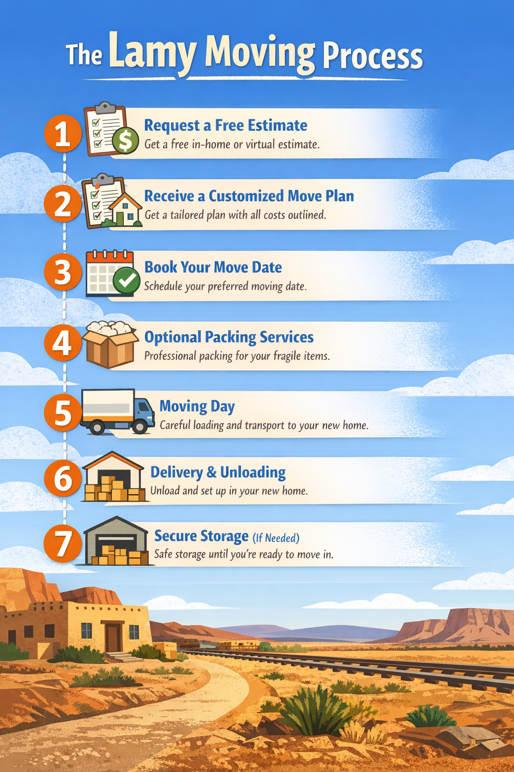 The remote desert location, limited paved roads, and historic adobe homes of Lamy, NM, often require special care when moving heavy furniture or delicate items. We’ve worked with families who have tight dirt driveways and buildings that can’t handle heavy equipment.